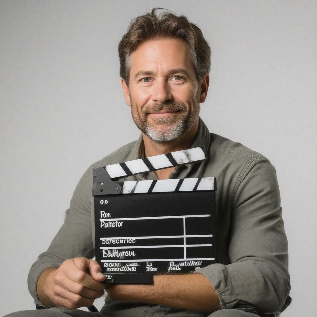 Generate a realistic portrait of Jake Paltrow, a middle-aged American film director, screenwriter, and actor, with a gentle smile, sitting in a director's chair on a film set, wearing a casual outfit and holding a clapperboard, with a subtle background hinting at his notable works, in a cinematic style.