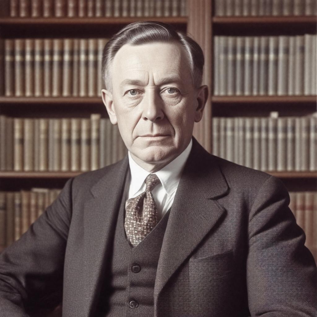 "Generate a realistic portrait of James Chadwick, a renowned British physicist, in a formal attire, sitting in a library or a study with a subtle background hinting at his work in nuclear physics, awarded the Nobel Prize in Physics, with a gentle and introspective expression, capturing his significant contributions to the field, particularly his discovery of the neutron."