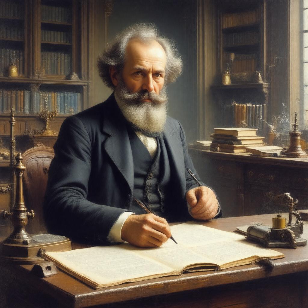 "Portrait of James Clerk Maxwell, a renowned Scottish physicist and mathematician, sitting in a Victorian-era study with papers, books, and scientific instruments around him, wearing formal attire, with a thoughtful expression, in a realistic oil painting style."