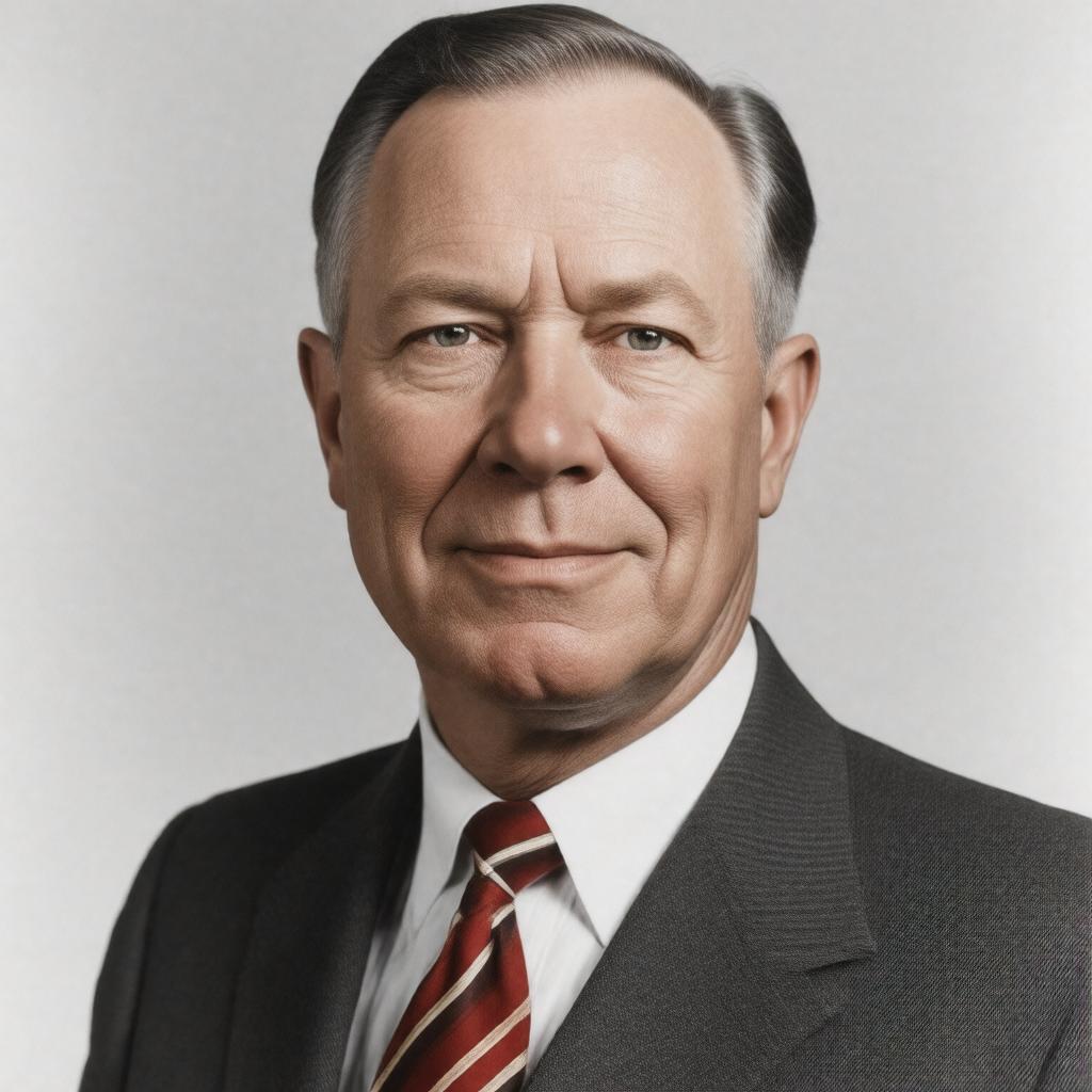 "Generate a realistic portrait of James Roosevelt, a middle-aged man with a dignified expression, wearing a suit and tie, with a subtle hint of a smile, set against a neutral background that reflects his personality as a politician, businessman, and military officer, incorporating elements that signify his affiliation with the Democratic Party and his notable achievements, in a style reminiscent of a formal photograph from the mid-20th century."