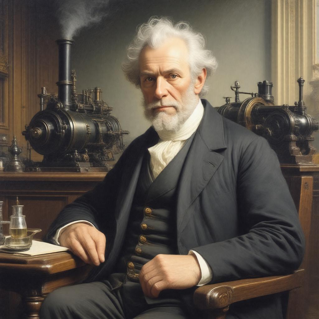 "Generate a realistic portrait of James Watt, a Scottish inventor, engineer, and chemist, sitting in a study with a steam engine model in the background, wearing 18th-century attire, with a thoughtful expression, in the style of a formal oil painting from the 18th century."