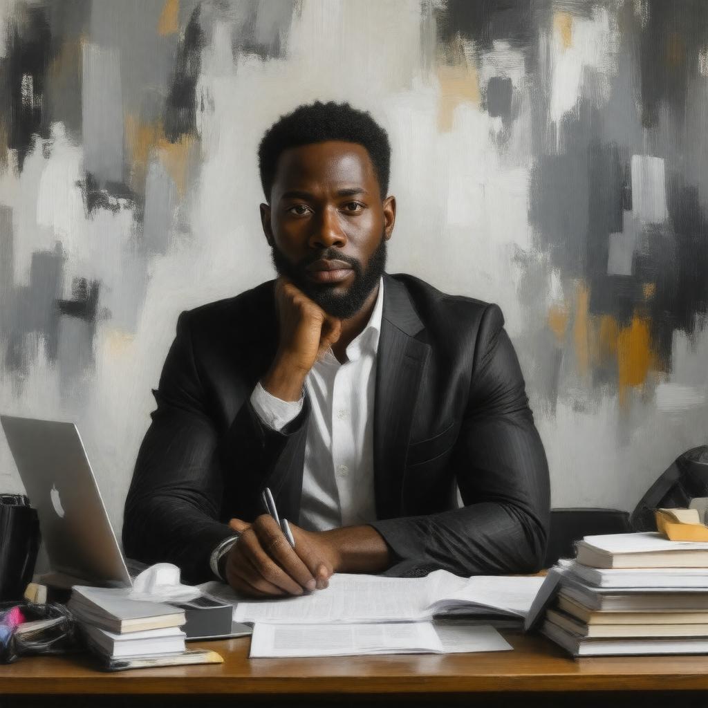 Create a realistic portrait of Jamil Smith, an American journalist and writer, sitting at a desk with a thoughtful expression, surrounded by papers, books, and a laptop, with a subtle background that hints at his work with Rolling Stone, The New Republic, or MTV News; he should be dressed in professional attire, conveying a sense of authority and introspection, reflecting his work on topics such as racism, politics, and culture.