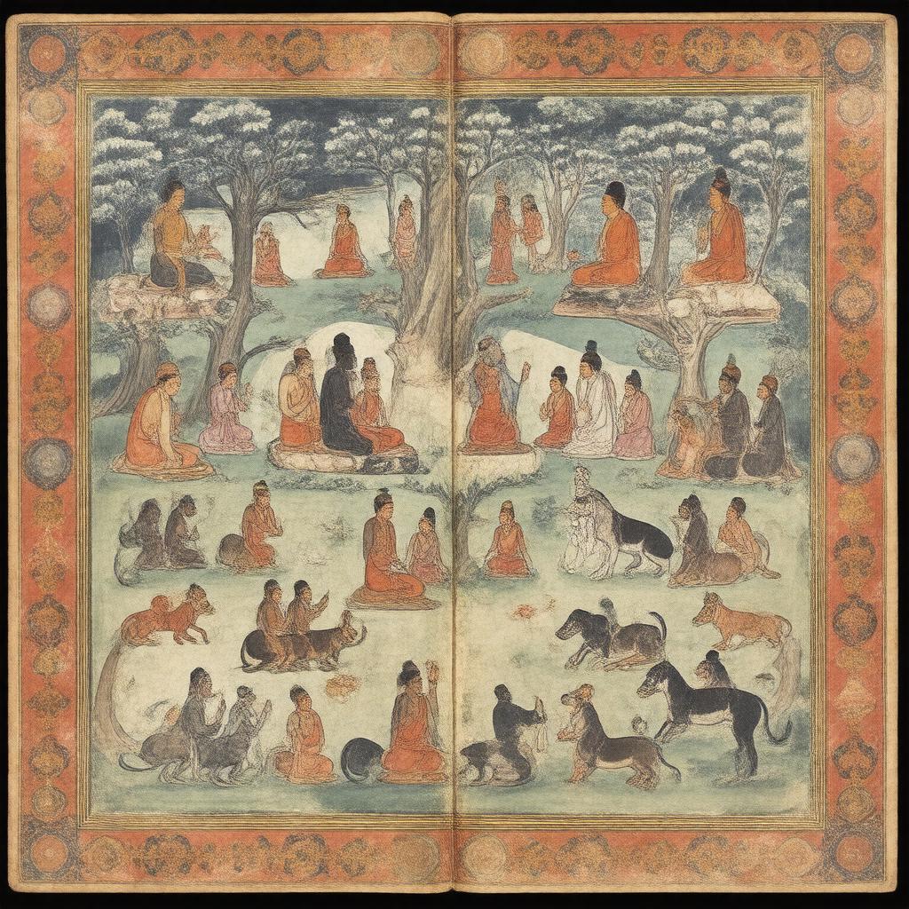 "An illuminated manuscript page from a Buddhist scripture, depicting a scene from the Jataka tales, with intricate Indian art style, showcasing a story of Buddha's previous births, surrounded by ornate borders and illustrations of animals, humans, and deities, in a mix of traditional Indian and Buddhist motifs."