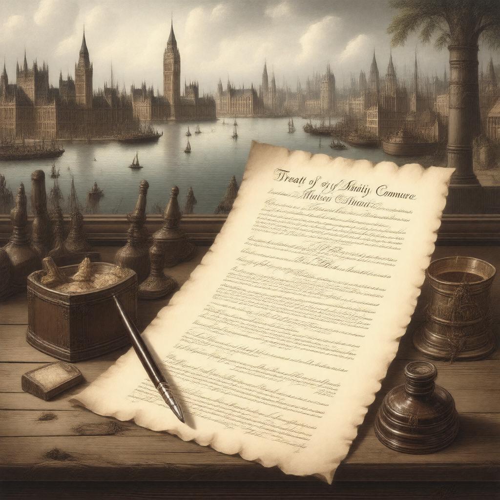 "Create an image of a historic document, specifically a treaty, with the title 'Treaty of Amity, Commerce, and Navigation, Between His Britannic Majesty and The United States of America', also known as the Jay Treaty. The document should be displayed on a wooden desk with a quill pen and an inkwell nearby, in a 18th-century style setting. In the background, a subtle image of the London cityscape during the 18th century can be seen. The document should be highlighted, with key sections and signatures visible, such as John Jay's signature. The style should be reminiscent of classic, historical illustrations, with muted colors and attention to detail."
