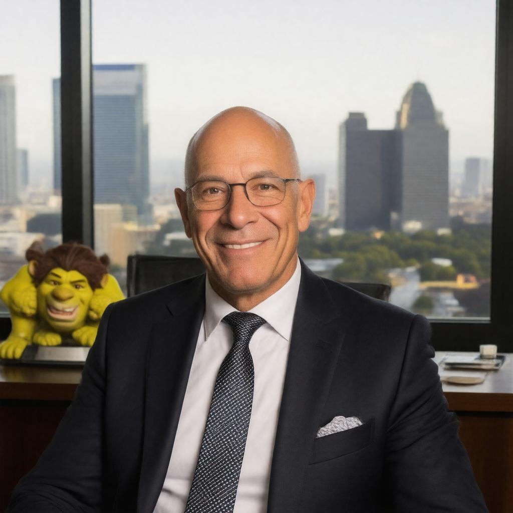 "Generate a realistic portrait of Jeffrey Katzenberg, a middle-aged American film producer and business executive, sitting in a luxurious office with a cityscape background, wearing a suit and a confident smile, with a hint of Hollywood glamour and a few subtle nods to his notable works, such as a Shrek or Lion King figurine on his desk."