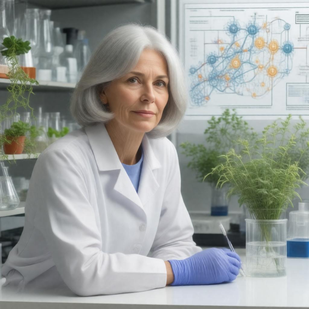 "Generate an image of Jennifer Doudna, a renowned American chemist and scientist, in a laboratory setting, surrounded by scientific equipment and plants, with a thoughtful expression, wearing a white lab coat and gloves, with a CRISPR-Cas9 genome editing technology diagram or model in the background, symbolizing her groundbreaking work in RNA biology and gene editing, in a realistic and professional style."