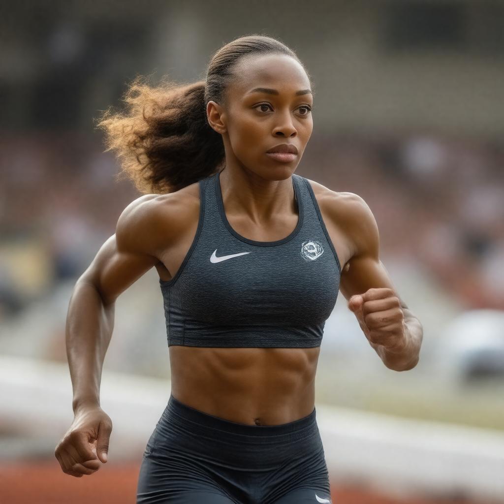 "Generate a realistic portrait image of Jessica Ennis-Hill, a British athlete, in action during a heptathlon event, wearing a sleek athletic outfit and showcasing her determination and strength, with a blurred background to emphasize her dynamic movement, in a photorealistic style."