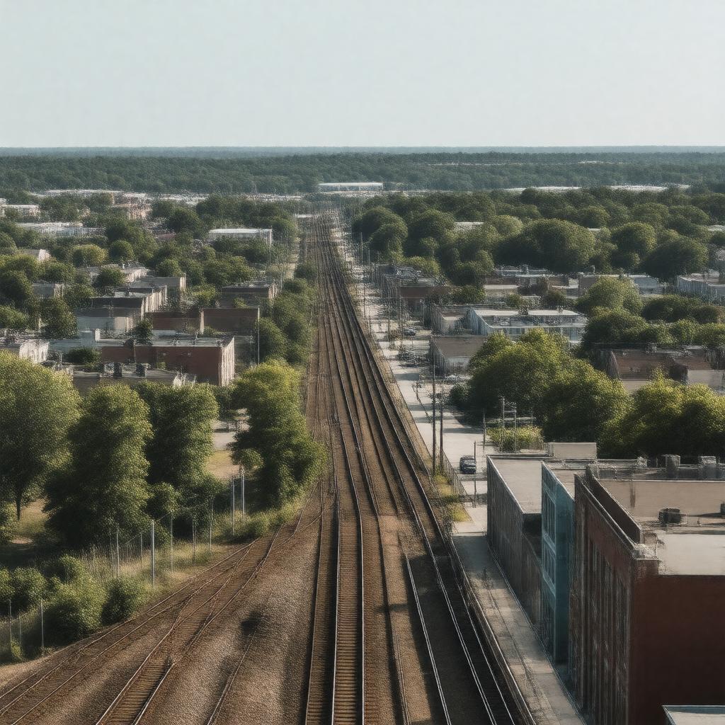"Generate a realistic image of a small city in the Eastern Time Zone, located in Wayne County, Georgia, United States, with a population of around 9,800 people, featuring a mix of residential and commercial buildings, a railroad track, and a few trees, with a subtle hint of a hospital and an airport in the distance, under a sunny daytime sky."
