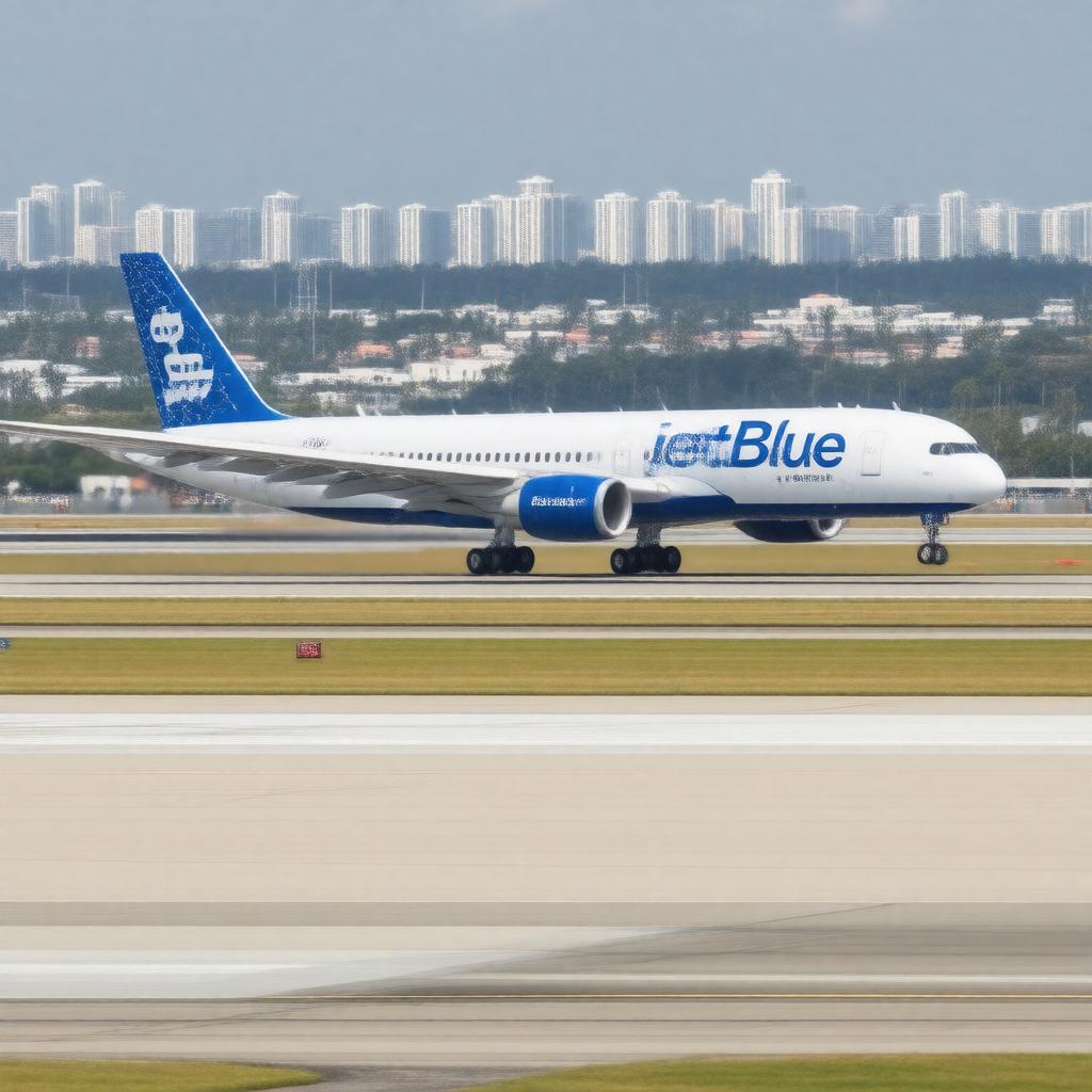 "Generate an image of a JetBlue airplane taking off from a sunny airport runway, with a cityscape in the background. The plane is painted in JetBlue's signature blue and white colors, with the company's logo prominently displayed on the side. The image should convey a sense of excitement and freedom, capturing the 'You Above All' spirit of the brand. Style: modern and sleek, with a focus on showcasing the plane and the airline's vibrant colors."