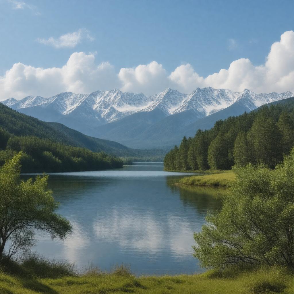 "Generate an image of a scenic landscape representing Jilin province in Northeast China, featuring the Changbai Mountains in the background, with a serene lake (such as Songhua Lake) in the foreground, surrounded by lush greenery and possibly some snow-capped peaks, incorporating elements that reflect the province's famous industries, such as a subtle image of an automobile or a ginseng plant, all under a bright, sunny sky with a hint of mist, in a realistic and majestic style."