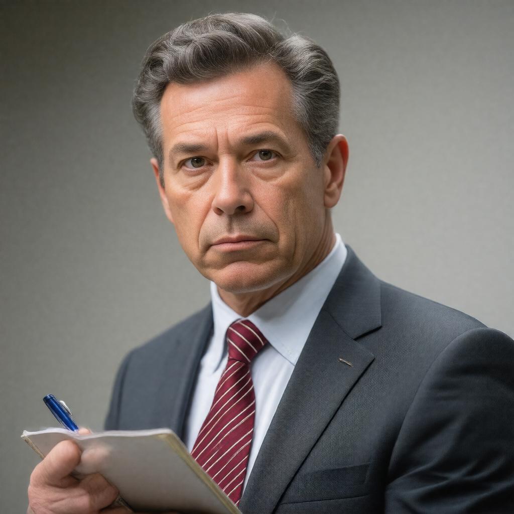 Generate a realistic image of a middle-aged American man with a serious expression, wearing a suit and holding a notebook and pen, with a subtle background suggesting a newsroom or press conference, representing Jim Vertuno, a male American journalist working for the Associated Press.