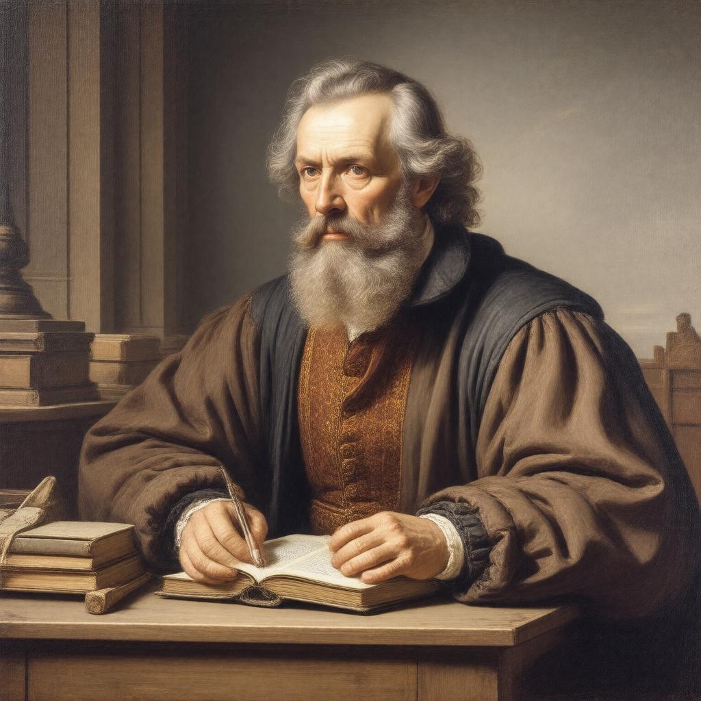 "Create a realistic portrait of Johann Gerhard, a German Lutheran theologian, in 17th-century attire, sitting at a desk with a book in hand, possibly 'Loci Theologici' or 'Meditations', in a study with a university background, reflecting his occupation as a Lutheran theologian and professor at the University of Jena, in a formal and serious Baroque style."