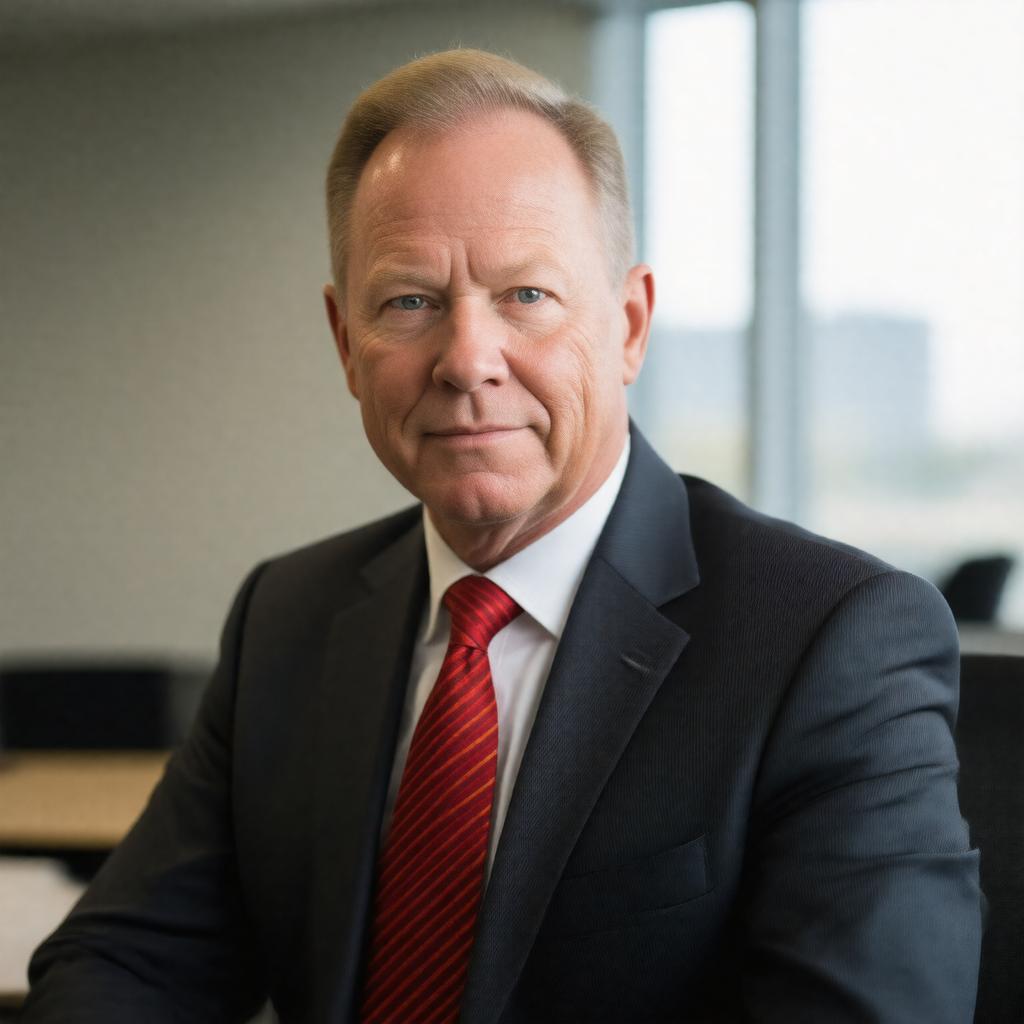Create a realistic portrait image of John Chambers, a middle-aged American business executive, sitting in a corporate office setting, wearing a suit and tie, with a confident expression, in a style that reflects his professional and executive persona as the former CEO of Cisco Systems.