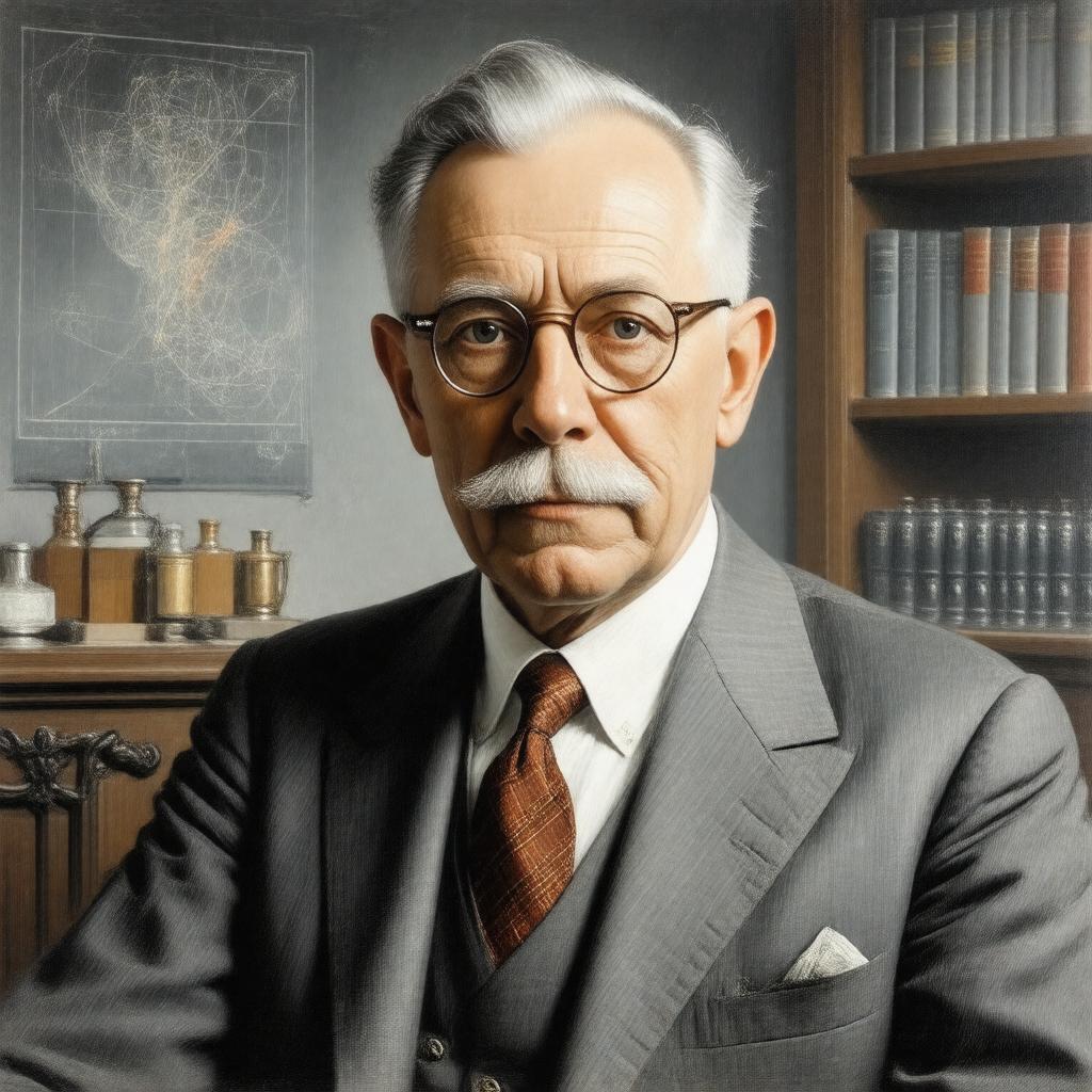 Create a realistic portrait of Sir John Douglas Cockcroft, a middle-aged British physicist with a distinguished expression, wearing a suit and tie, in a formal study setting with subtle hints of nuclear physics and academia in the background, reflecting his achievements and contributions to the field, including a Nobel Prize in Physics, awarded in 1951.