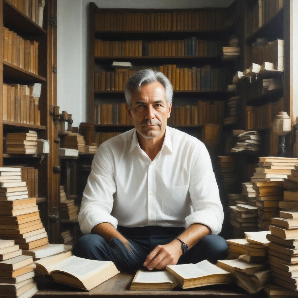 Generate a realistic portrait of a middle-aged man with a gentle expression, wearing a simple white shirt and dark pants, sitting in a quiet library surrounded by old books and papers, representing John Evans, a human.