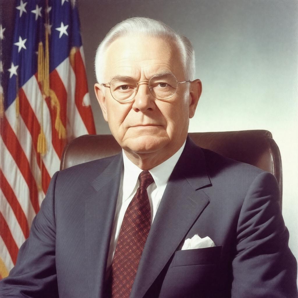"Portrait of John Foster Dulles, a middle-aged man with a serious expression, wearing a formal suit and tie, sitting in a chair with a backdrop of the United States flag, symbolizing his role as a prominent diplomat and politician, specifically as the 52nd United States Secretary of State, in a realistic and formal style."