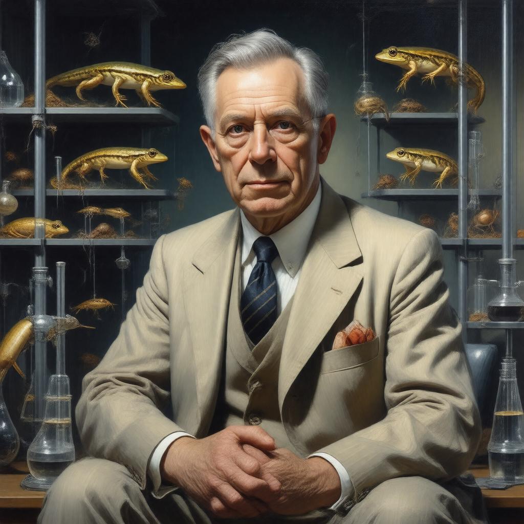 Create a realistic portrait of Sir John Bertrand Gurdon, a British developmental biologist, sitting in a laboratory setting with a subtle background of Xenopus laevis, the African clawed frog often used in his research. He is dressed in a formal suit with a hint of a lab coat, symbolizing his contributions to both science and his prestigious awards. Include a few subtle nods to his work, such as a Nobel Prize medal or a representation of cell cloning in the background. Capture his expression with a sense of contemplation and wisdom, reflecting his groundbreaking work in nuclear transplantation and cloning. Style: Photorealistic.