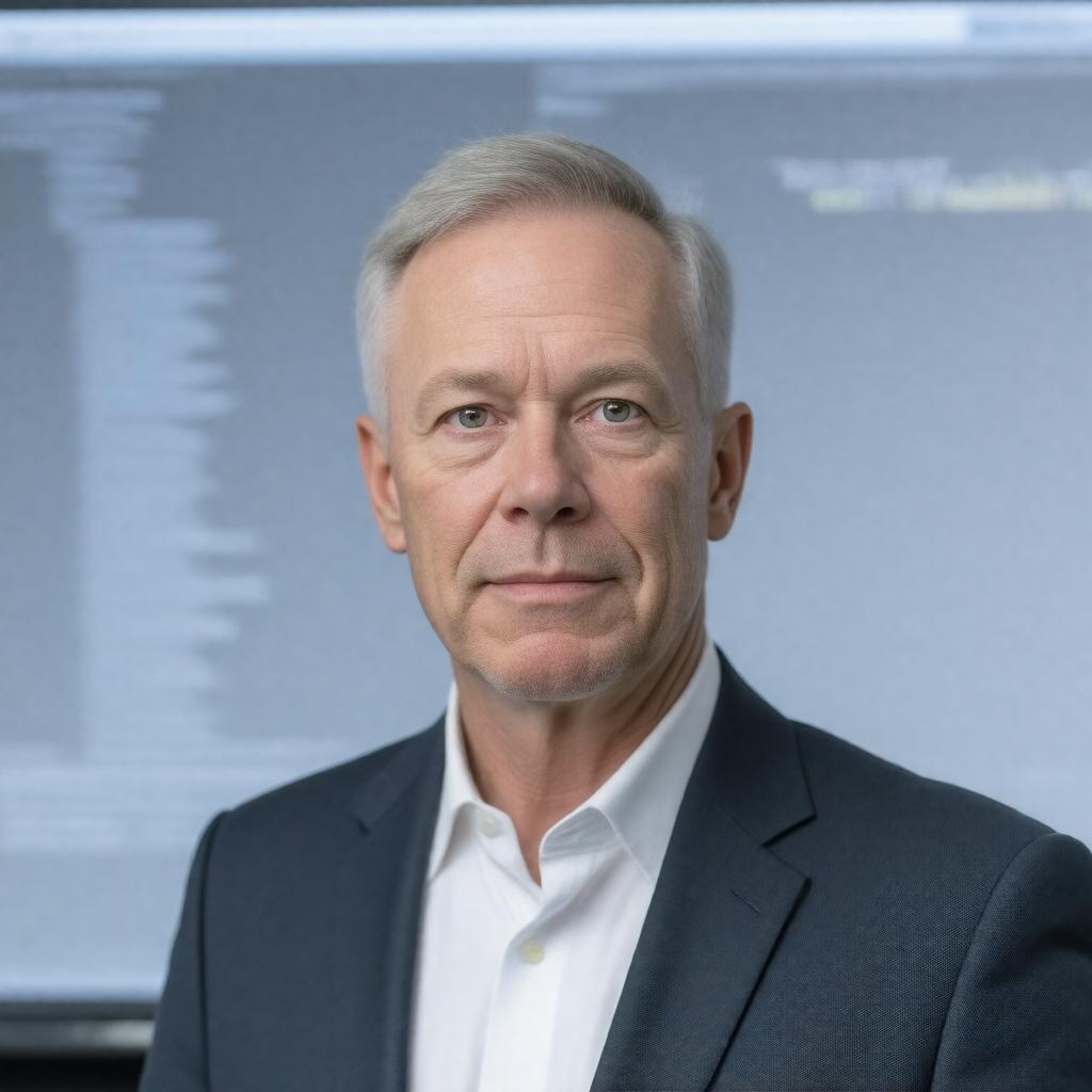 Generate a realistic image of John Guttag, a middle-aged American man with a professional demeanor, wearing a suit and standing in front of a background that represents his affiliation with the Massachusetts Institute of Technology, possibly with a subtle nod to his work in computer science, such as a faint image of a computer screen or code in the background.