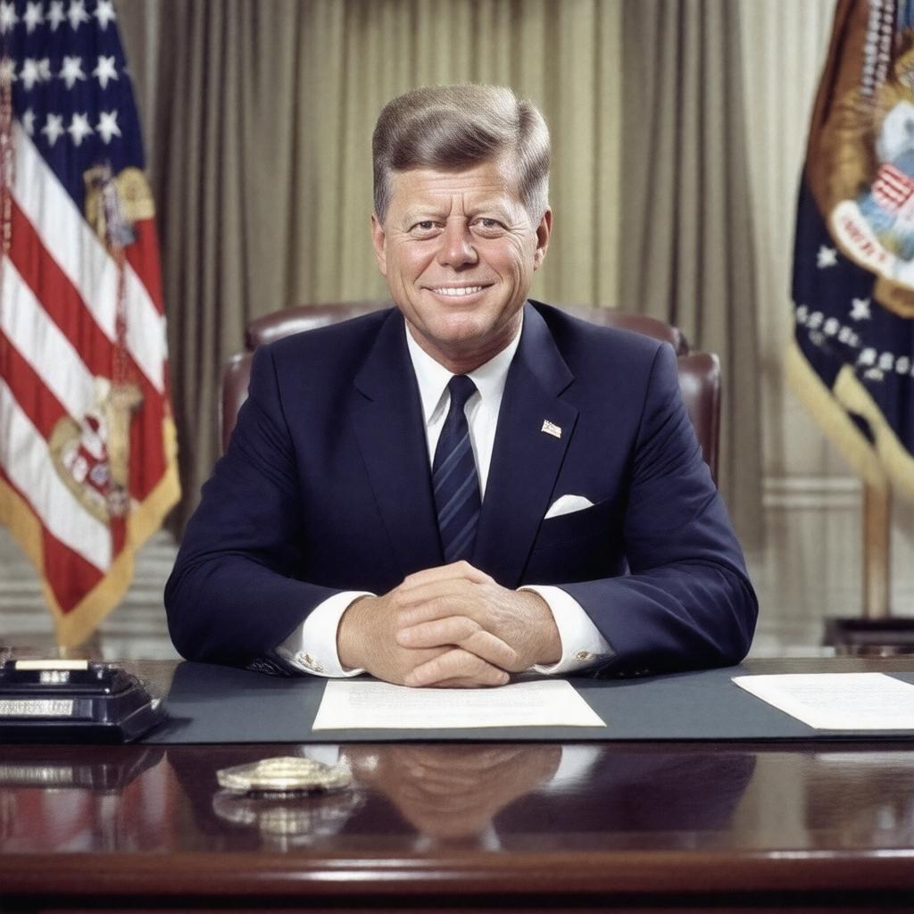 Generate an image of John F. Kennedy, the 35th President of the United States, in a realistic and formal style, sitting behind the Oval Office desk, wearing a suit and tie, with a subtle smile, conveying a sense of leadership and charisma, in the manner of a classic presidential portrait.