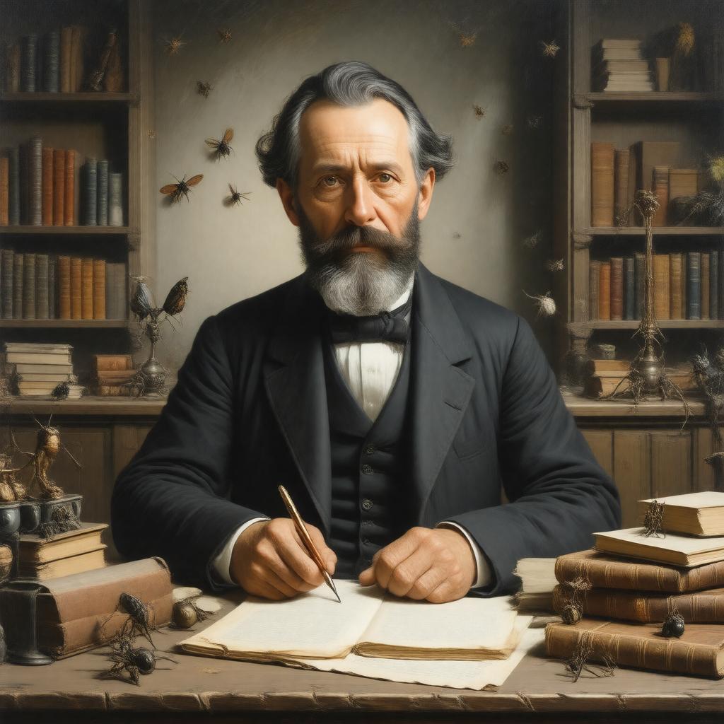Generate an image of a 19th-century American entomologist, specifically John Lawrence LeConte, in a realistic style, sitting at a wooden desk surrounded by books, papers, and entomological specimens, with a subtle background hinting at his connection to nature and science, wearing attire typical of his era, with a serious yet contemplative expression, reflecting his contributions to the field of entomology, particularly his work on Coleoptera taxonomy.
