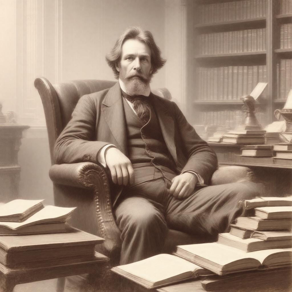 Create an image of John Ruskin, a British person, in a realistic style, sitting in a Victorian-era armchair, surrounded by books and papers, with a contemplative expression, wearing 19th-century attire, in a study or library setting, reflecting his occupations as a literary critic, writer, philosopher, and social thinker.