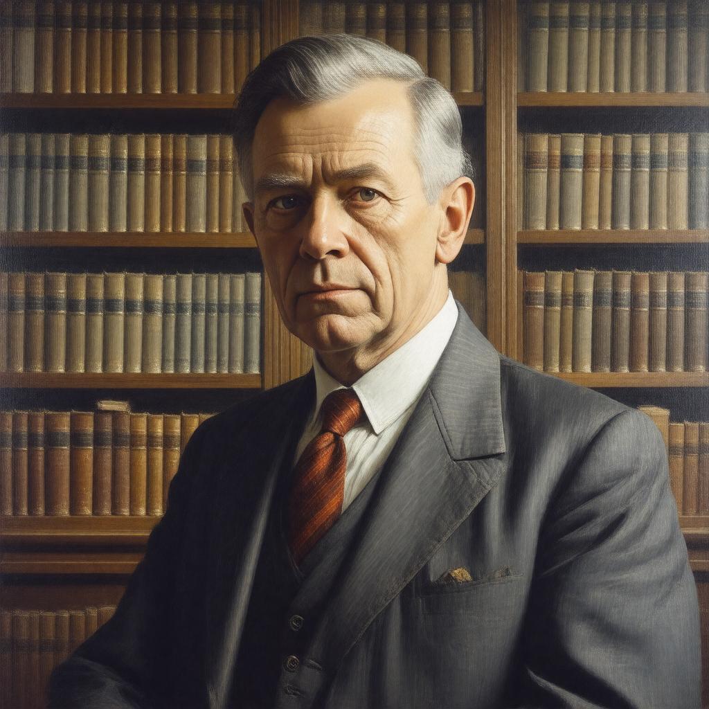 Generate a realistic portrait of John Strachey, a middle-aged British politician and writer from the mid-20th century, dressed in formal attire, with a thoughtful expression, set against a backdrop that subtly suggests his involvement in politics and literature, such as a bookshelf or a parliamentary interior; incorporate elements that reflect his socialist ideology and notable works, in a style that balances photorealism with a hint of period-specific character.