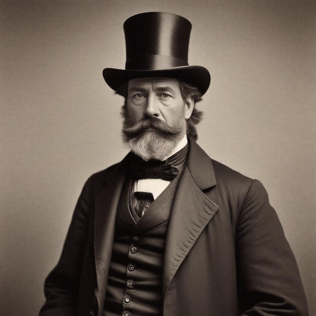 Generate a realistic portrait of John Taylor Johnston, an American gentleman from the 19th century, dressed in formal attire, possibly with a top hat and coat, reflecting his status as a prominent figure in American railroads and the arts, specifically highlighting his role as the first president of the Metropolitan Museum of Art, in a style reminiscent of a formal photograph or painting from the era.