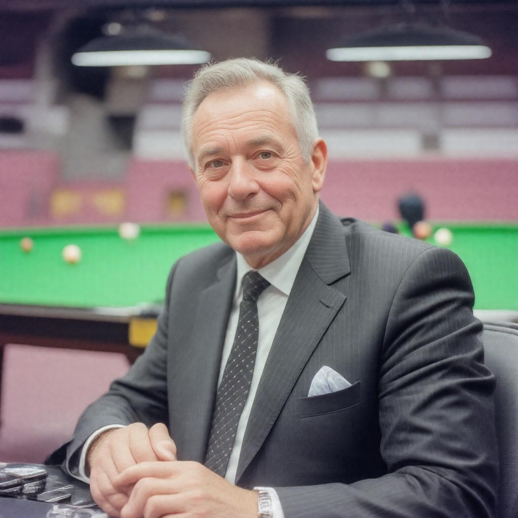 Generate a realistic image of a middle-aged British man with a friendly demeanor, sitting in a TV commentary booth, wearing a suit and holding a microphone, with a snooker table in the background; he has short hair and a slight smile, embodying John Virgo, the renowned British snooker commentator and former professional tennis player.