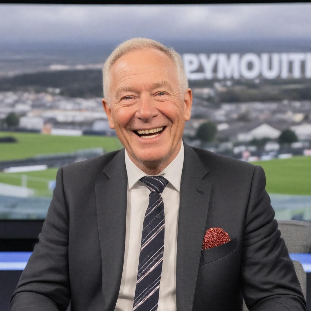 Generate a realistic image of a British sports commentator in his mid-60s, with a warm and engaging smile, sitting in a television studio with a BBC or sports broadcasting backdrop, wearing a suit and holding a microphone, with a hint of a cityscape (possibly Plymouth) in the background, in a style that reflects his profession and personality.
