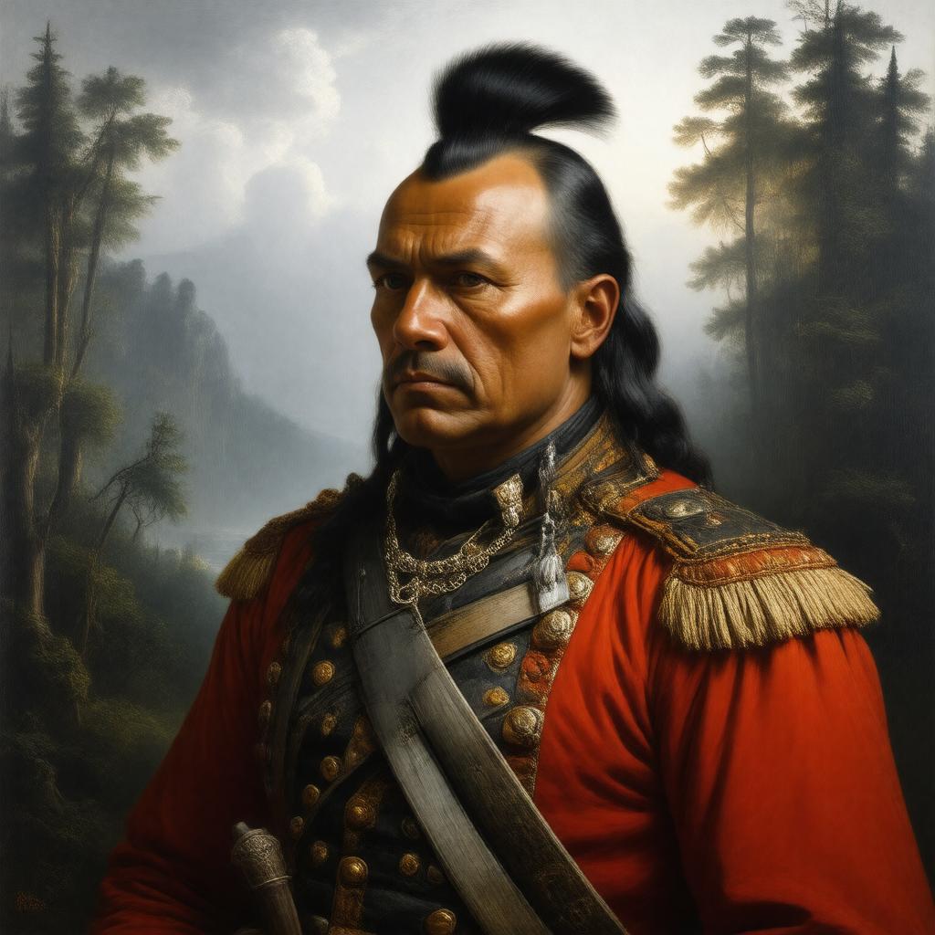 "Create a realistic portrait of Joseph Brant, a Mohawk military leader, in 18th-century attire, with a strong and determined expression, set against a backdrop of a misty forest or a colonial-era landscape, in a classical oil painting style."