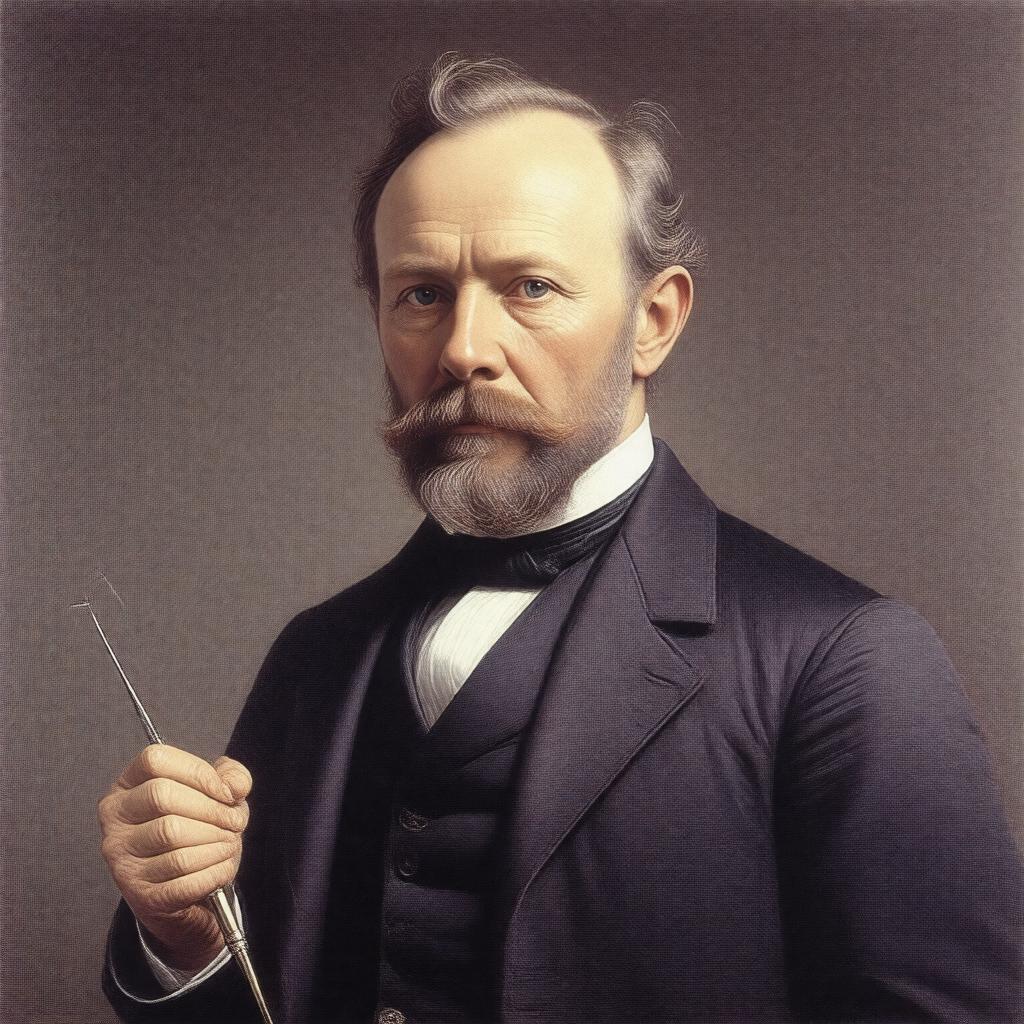 Generate a realistic portrait image of Joseph Lister, a British physician and researcher, in a 19th-century surgical setting, wearing formal attire and holding a surgical instrument, with a subtle background hinting at his pioneering work in antiseptic surgery.