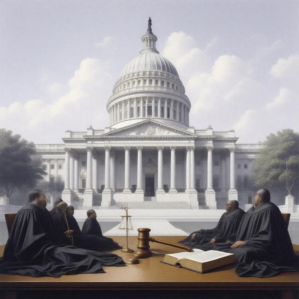 "Create an image of a grand, neoclassical building with a large dome, representing the Judicial branch of the United States. The building should be surrounded by columns and have a set of scales of justice in front of it. In the foreground, include a few judges' robes draped over chairs, with a gavel and a law book lying on a table. The background should be a subtle, serene landscape of the United States Capitol Building. The style should be formal, realistic, and reminiscent of 19th-century American art. The image should convey a sense of authority, fairness, and justice."