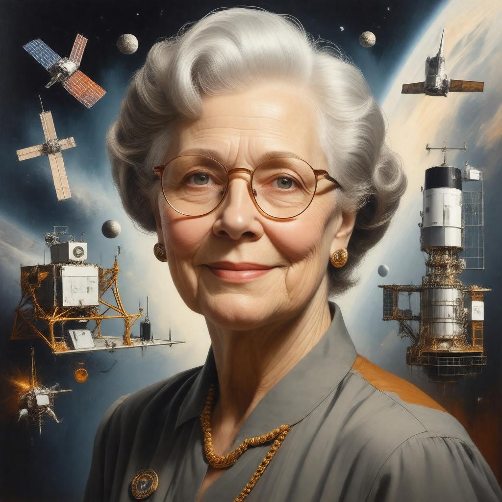 Create an image of Judith Love Cohen, an American engineer, author, and advocate for women in STEM, in a professional setting that reflects her work in electrical engineering and her contributions to NASA and the Apollo program, surrounded by elements that symbolize her notable works such as the Apollo Lunar Module Abort-Guidance System, Hubble Space Telescope, and Tracking and Data Relay Satellite, and including subtle references to her work in promoting women in STEM and her children's book series "You Can Be a Woman..." with a background that hints at her California residence and her Jewish American heritage.