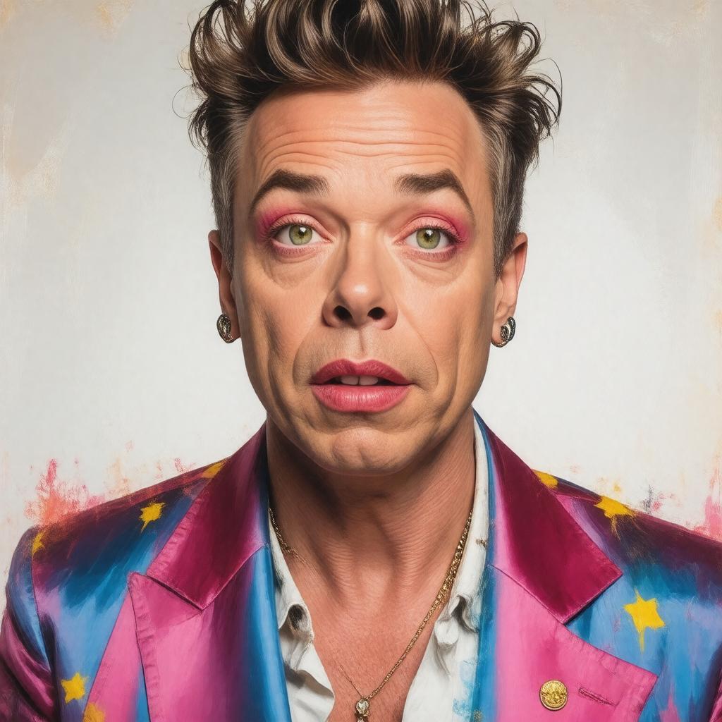 Create an image of Julian Clary, a British comedian, actor, novelist, and television presenter, in a vibrant and playful style, showcasing his flamboyant personality. Depict him in a scene that captures his comedic essence, possibly incorporating elements from his notable works, such as Sticky Moments or Priscilla, Queen of the Desert. Include subtle hints at his gay identity and British heritage. Render the image in a colorful, exaggerated, and cartoonish style, blending realism with caricature, to reflect Clary's larger-than-life stage presence.