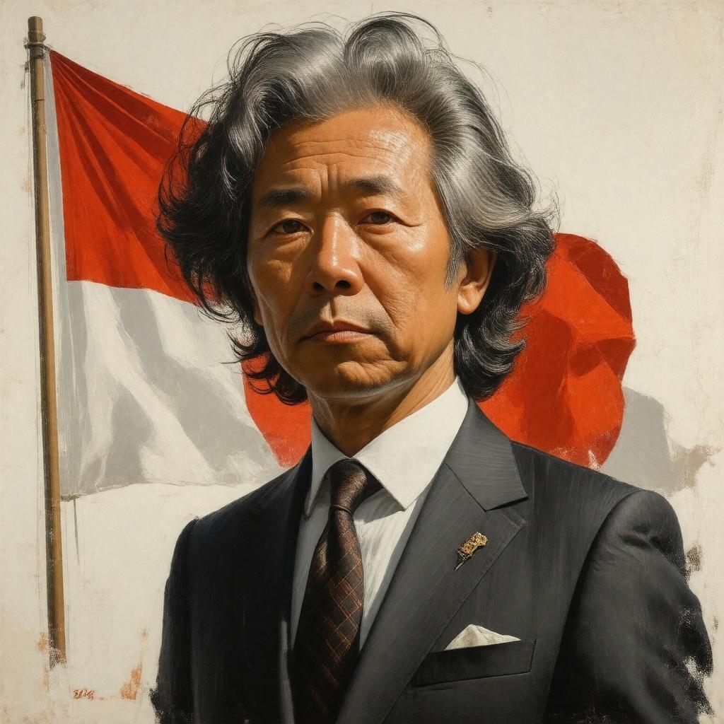 "Generate a realistic portrait of Junichiro Koizumi, the 56th Prime Minister of Japan, in a formal suit, with a dignified expression, standing in front of a Japanese flag, incorporating subtle elements that reflect his notable policies and personality, in a style that blends traditional and modern Japanese art elements."