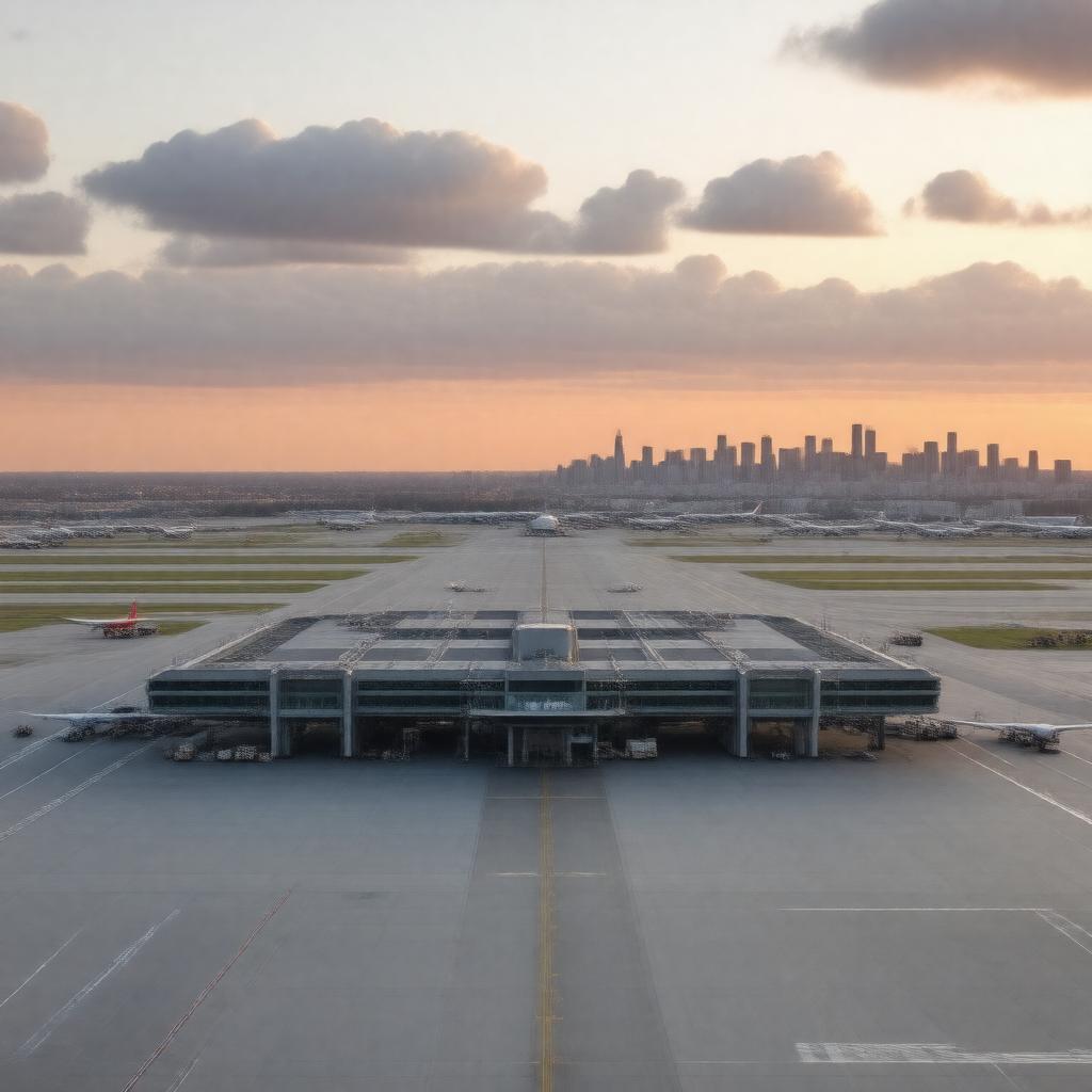 "Generate a realistic image of Newark Liberty International Airport (KEWR) at sunset, with Terminal C in the foreground, surrounded by aircraft and ground vehicles, with the New York City skyline visible in the distance, under a partly cloudy sky with a warm color palette, in a daytime setting."