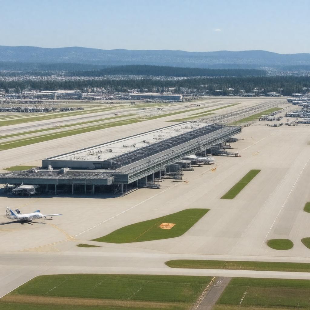 Generate a realistic image of Portland International Airport (KPDX) on a sunny day, showcasing its terminal building, runways, and surrounding landscape, with a few airplanes on the tarmac and a scenic view of the Portland metropolitan area in the background, in a daytime setting with a photorealistic style.