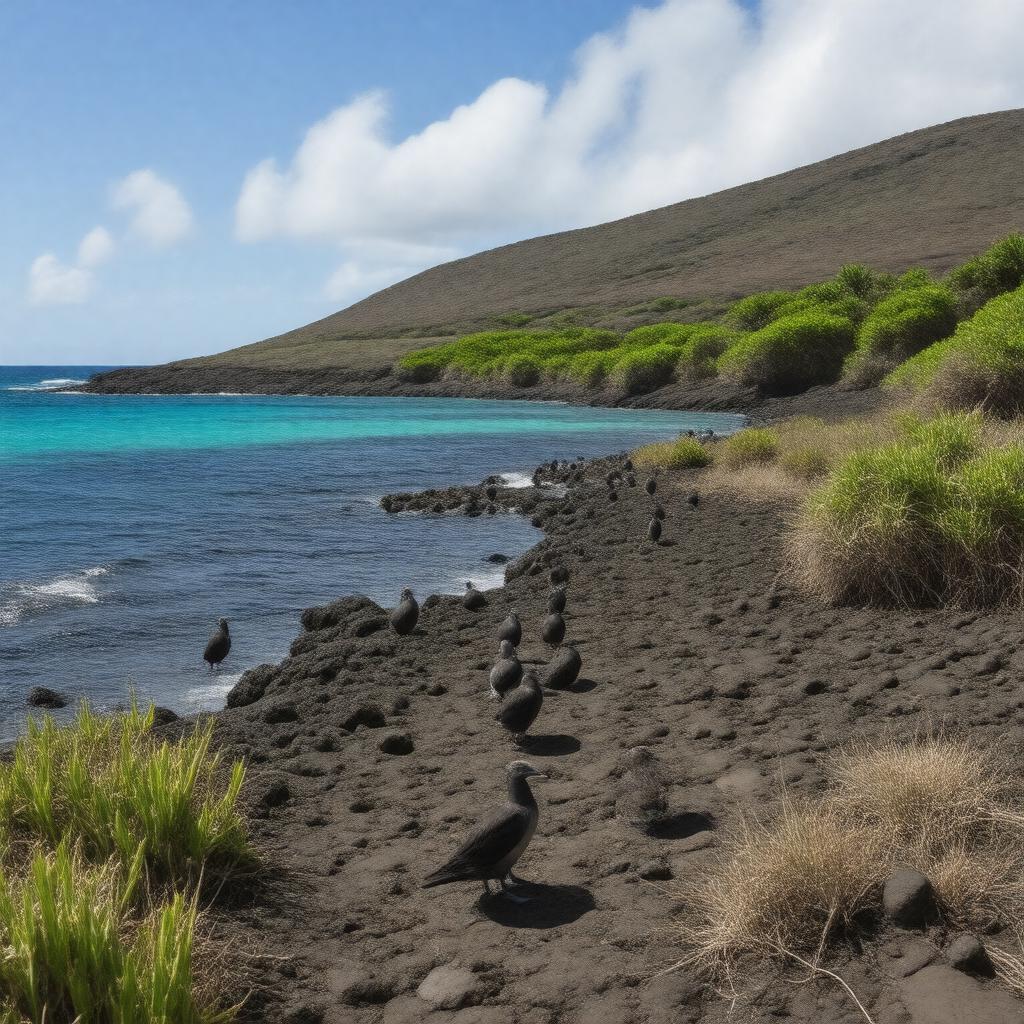 Generate an image of a serene and natural landscape of Kahoʻolawe, an uninhabited island located 7 miles off the coast of Maui, with a backdrop of clear blue waters and a sky with scattered clouds, showcasing its 44.6 square miles of arid terrain covered with largely non-native grasses, and featuring endangered Hawaiian seabirds in their natural habitat, with a subtle hint of the island's complex history and cultural significance, including remnants of past military use, while maintaining a sense of tranquility and restoration, in a realistic and documentary-style photography aesthetic.