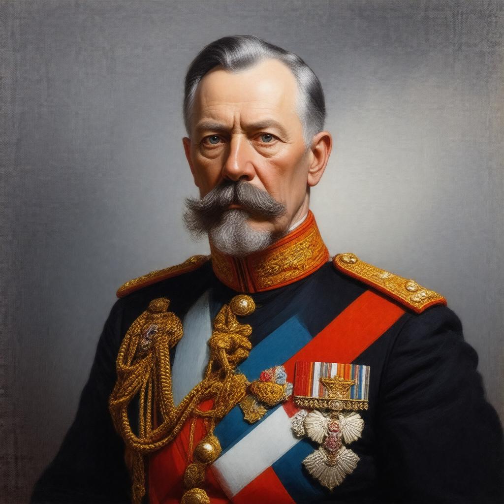 "Generate a realistic portrait of Kaiser Wilhelm II, the last German Emperor, in his military uniform as a Field Marshal, adorned with the Order of the Black Eagle, Order of the Garter, and Order of St. Andrew, standing in a formal pose with a stern expression, in the style of a late 19th or early 20th-century oil painting."
