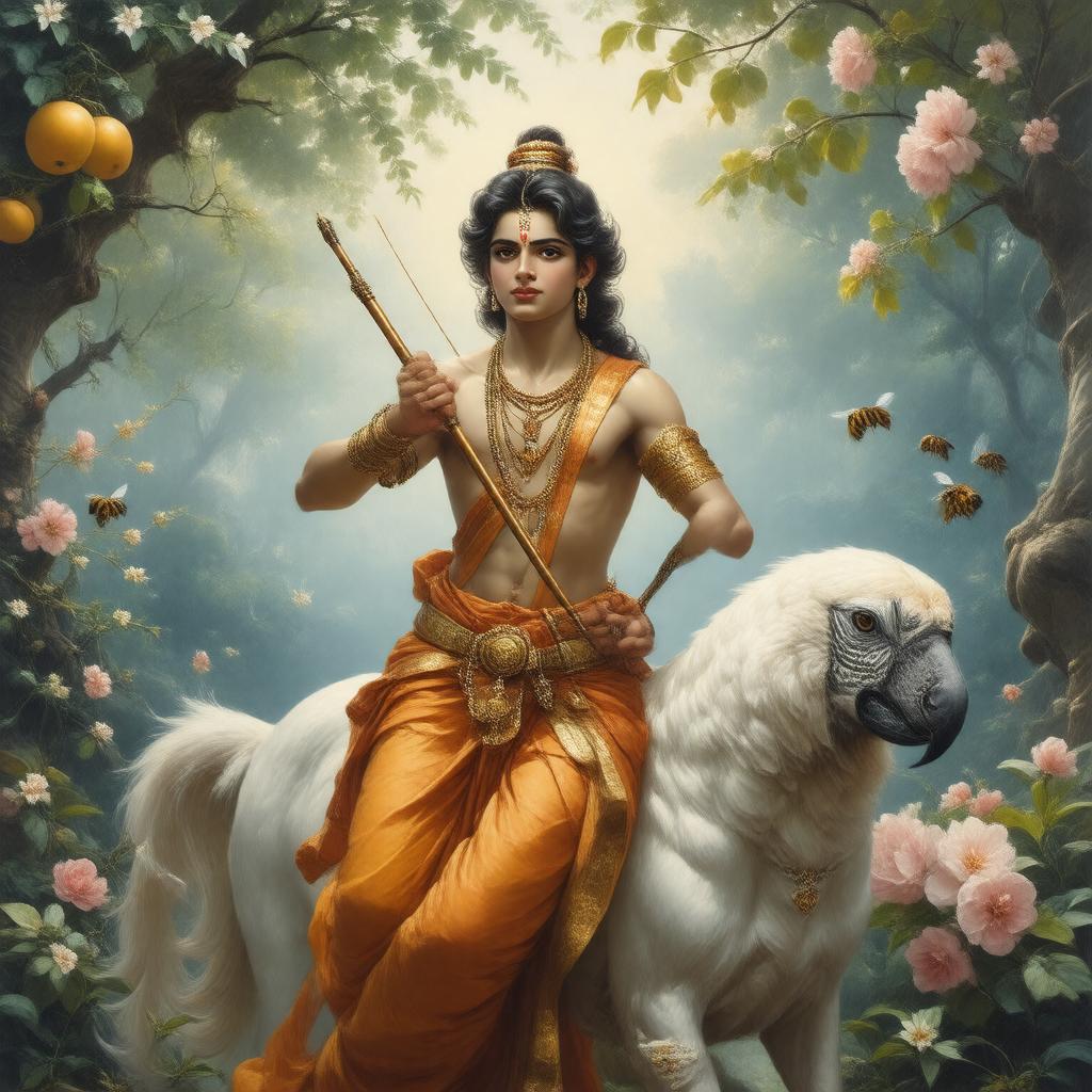 Generate an image of Kama, the Hindu deity of desire, love, and pleasure, depicted as a handsome youth holding a sugarcane bow and flower arrows, riding a parrot, surrounded by symbols of spring and fertility, such as mango blossoms, jasmine, and ashoka tree flowers, with a gentle breeze and a honeybee nearby, set against a vibrant and lush backdrop, in a style that blends traditional Indian art with a touch of whimsy and sensuality.