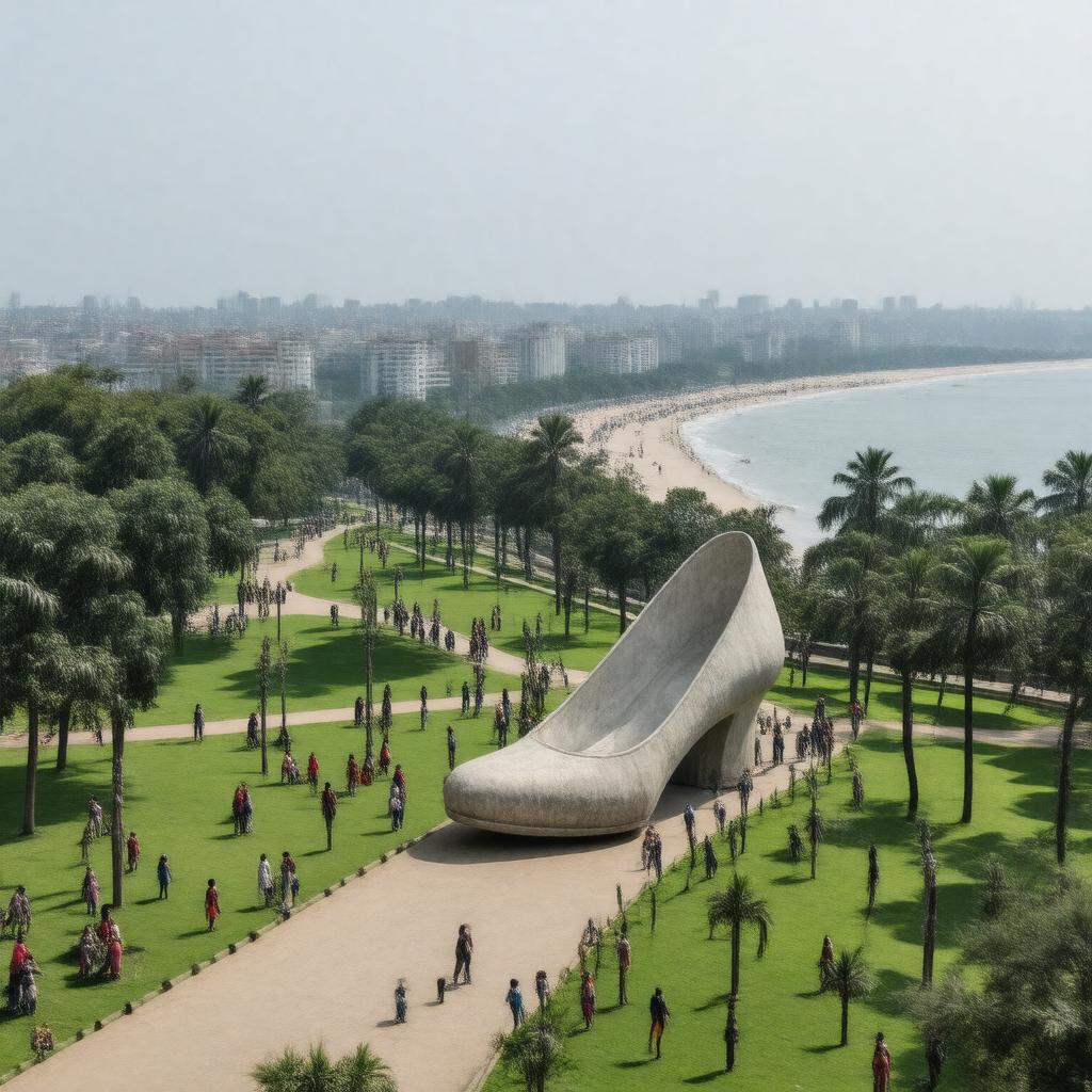 "Generate an image of a vibrant public park situated on a hill overlooking the Marine Drive and Chowpatty Beach in Mumbai, India. The park, named after Kamala Nehru, features a prominent Old Woman's Shoe structure and spans approximately 4,000 square meters. Depict the park in a realistic style, showcasing its lush greenery and lively atmosphere, with children playing and people enjoying the scenic views of the coastline. Incorporate the park's unique shoe-shaped structure and capture the essence of this popular tourist attraction and children's park, established in 1952 and renovated in 2017."