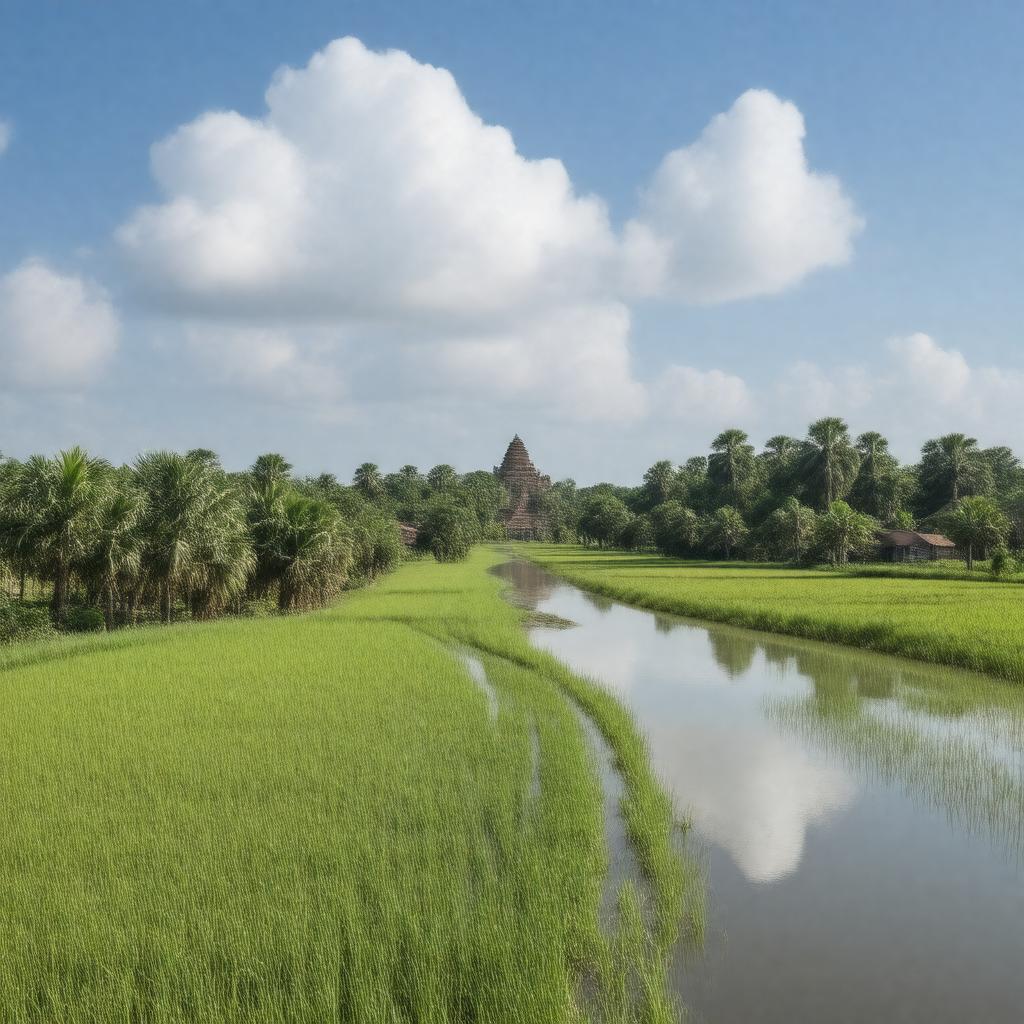 Generate an image of a scenic view of Kampong Thom province in Cambodia, showcasing its lush agricultural landscape, with rice fields and rural villages along the Stung Sen River, with a glimpse of a traditional Khmer temple in the background, such as Sambor Prei Kuk, under a bright blue sky with a few puffy white clouds, in a realistic and serene style.