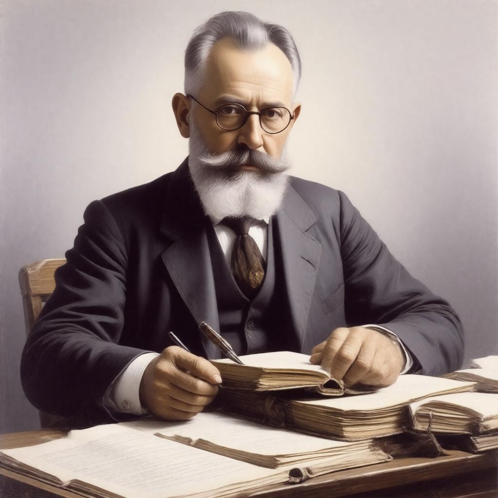 Generate an image of Karl Kautsky, a prominent Marxist theorist, writer, and philosopher, sitting at a desk with a book in hand, surrounded by papers and a pen, wearing a suit and tie, with a serious expression, in a style reminiscent of late 19th or early 20th-century realism, reflecting his Austrian-German heritage and intellectual pursuits.