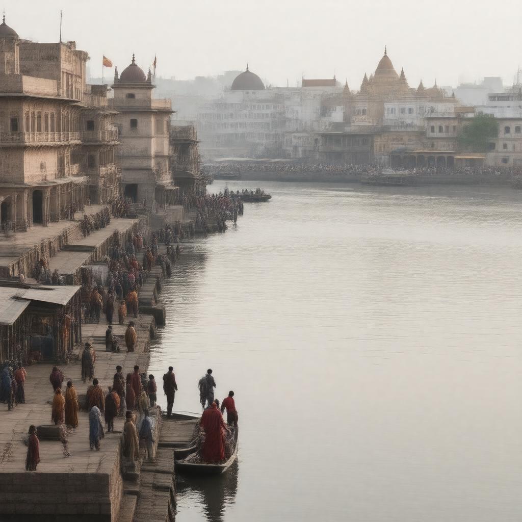 "Generate a realistic image of Kashi, a city located in the state of Uttar Pradesh, India, situated on the banks of the Ganges River, showcasing its iconic Ghats and Kashi Vishwanath Temple, with a bustling atmosphere and a blend of ancient and modern architecture, in a daytime setting with a humid subtropical climate."