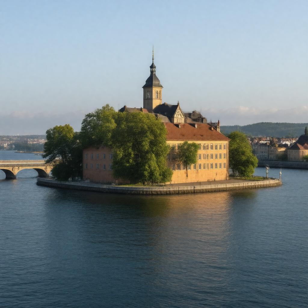 "Generate a realistic image of Kastellholmen, a small island located in Stockholm, Sweden, with Kastellet, a notable building, prominently featured, surrounded by water and connected to Skeppsholmen via a bridge, under a serene daylight setting."