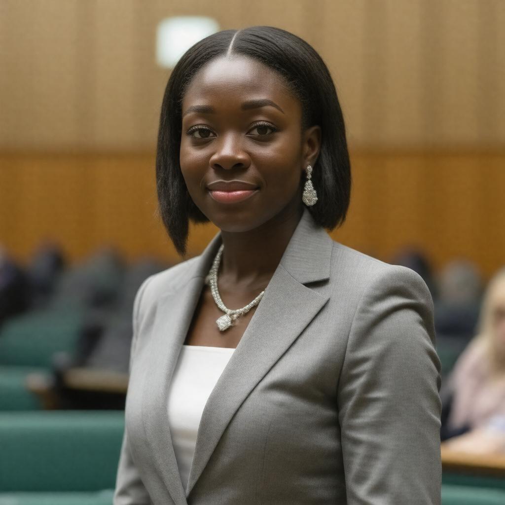 Generate a realistic photograph of Kate Osamor, a British Labour Party politician, in a formal setting, such as the UK Parliament, with a confident expression, wearing a professional outfit, and with a subtle hint of her Nigerian heritage in the background or through a piece of jewelry, highlighting her role as a Member of Parliament and former Shadow Secretary of State for International Development.