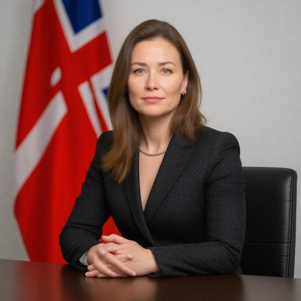 "Generate a realistic portrait of Katrín Jakobsdóttir, the Prime Minister of Iceland, sitting in a formal setting with the Icelandic flag in the background, wearing a professional outfit and displaying a confident expression, in a style that reflects her position as a prominent female leader in Icelandic politics."