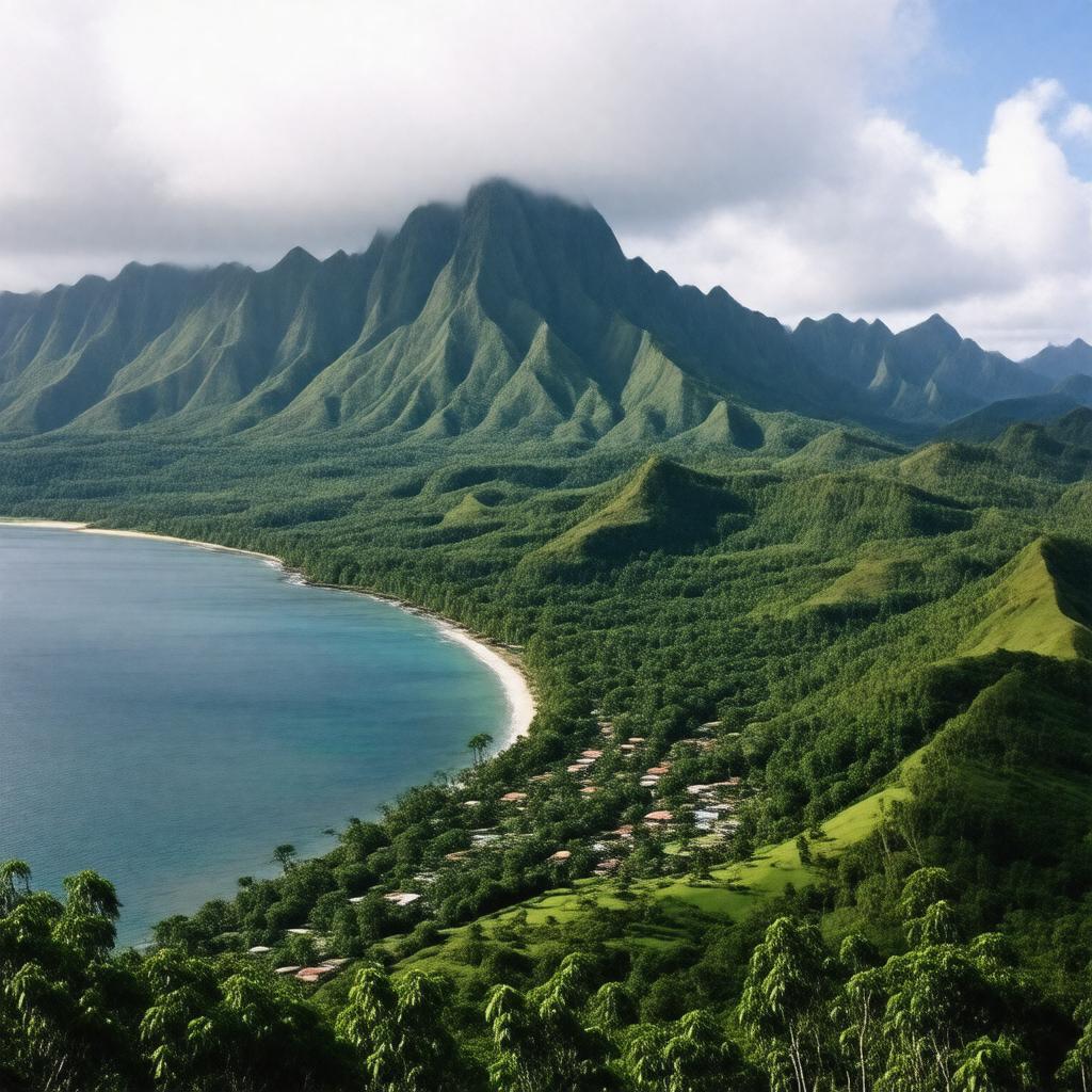 "Generate an image of a lush, green island with a scenic coastline, featuring Waimea Canyon, Nā Pali Coast, and Mount Waiʻaleʻale in the background, with a small town, such as Kapaʻa or Lihue, in the foreground, representing Kauaʻi, also known as The Garden Isle, with a tropical climate and high annual rainfall, in a realistic and serene style."