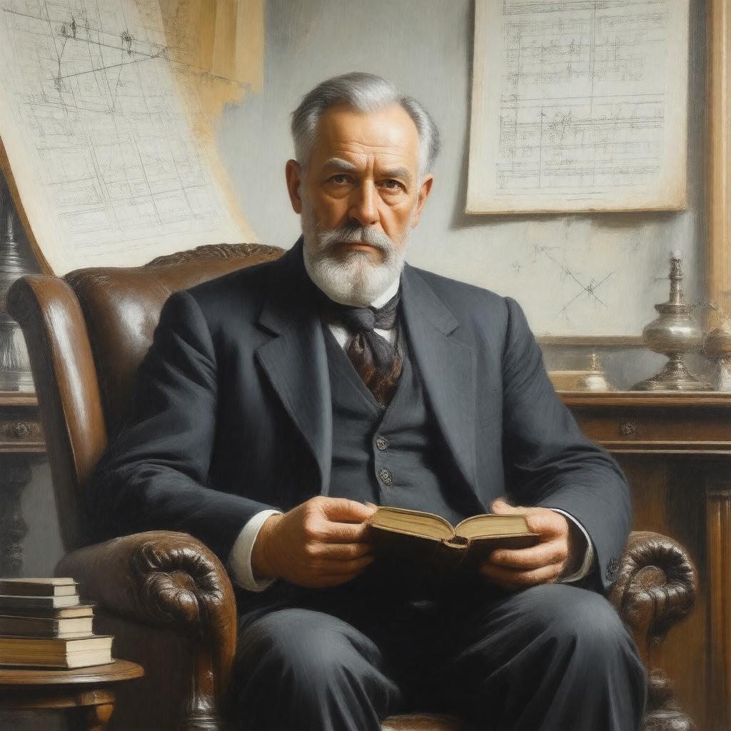 Create a realistic portrait of Kazimierz Kuratowski, a middle-aged Polish mathematician with a gentle expression, wearing formal attire, sitting in a classic armchair with a book in his hand, surrounded by mathematical notes and diagrams, in a warm and cozy study with a subtle background of academic or mathematical symbols, in a style that reflects a 20th-century realistic representation.