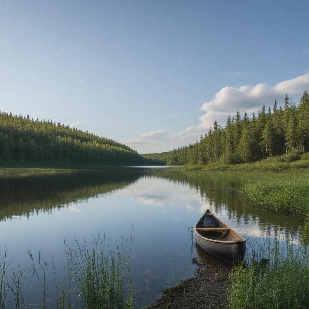 "Generate an image of a serene and natural landscape of Kejimkujik National Park, located in Nova Scotia, Canada. The image should feature a tranquil lake, possibly Kejimkujik Lake, surrounded by lush Acadian forest and wetlands. In the distance, a canoe can be seen gliding across the lake, with a few petroglyphs visible on the shore. The sky above should be a deep shade of blue, with stars beginning to twinkle, highlighting the park's dark sky preserve status. A few wildlife elements, such as a moose or a loon, can be subtly incorporated into the scene. The overall style should be realistic and evocative of the park's natural beauty, with a muted color palette that reflects the region's unique atmosphere."